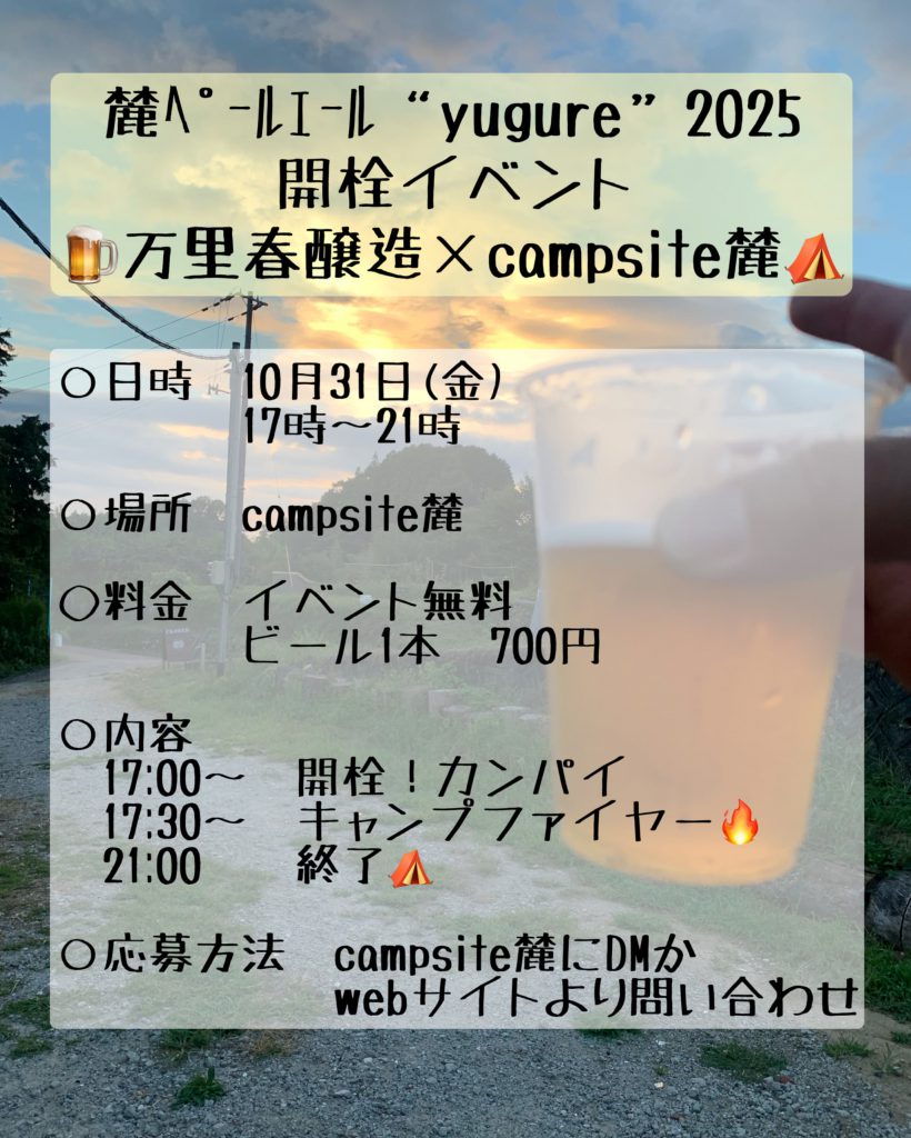 この日キャンプ泊される方は、20時までチェックインできますので、ぜひ宿泊予約をしてくださいね🏕️campsite麓で育った生ホップをたっぷり使った“yugure”2025!開栓の喜びを、ぜひ一緒に分かち合いましょう!